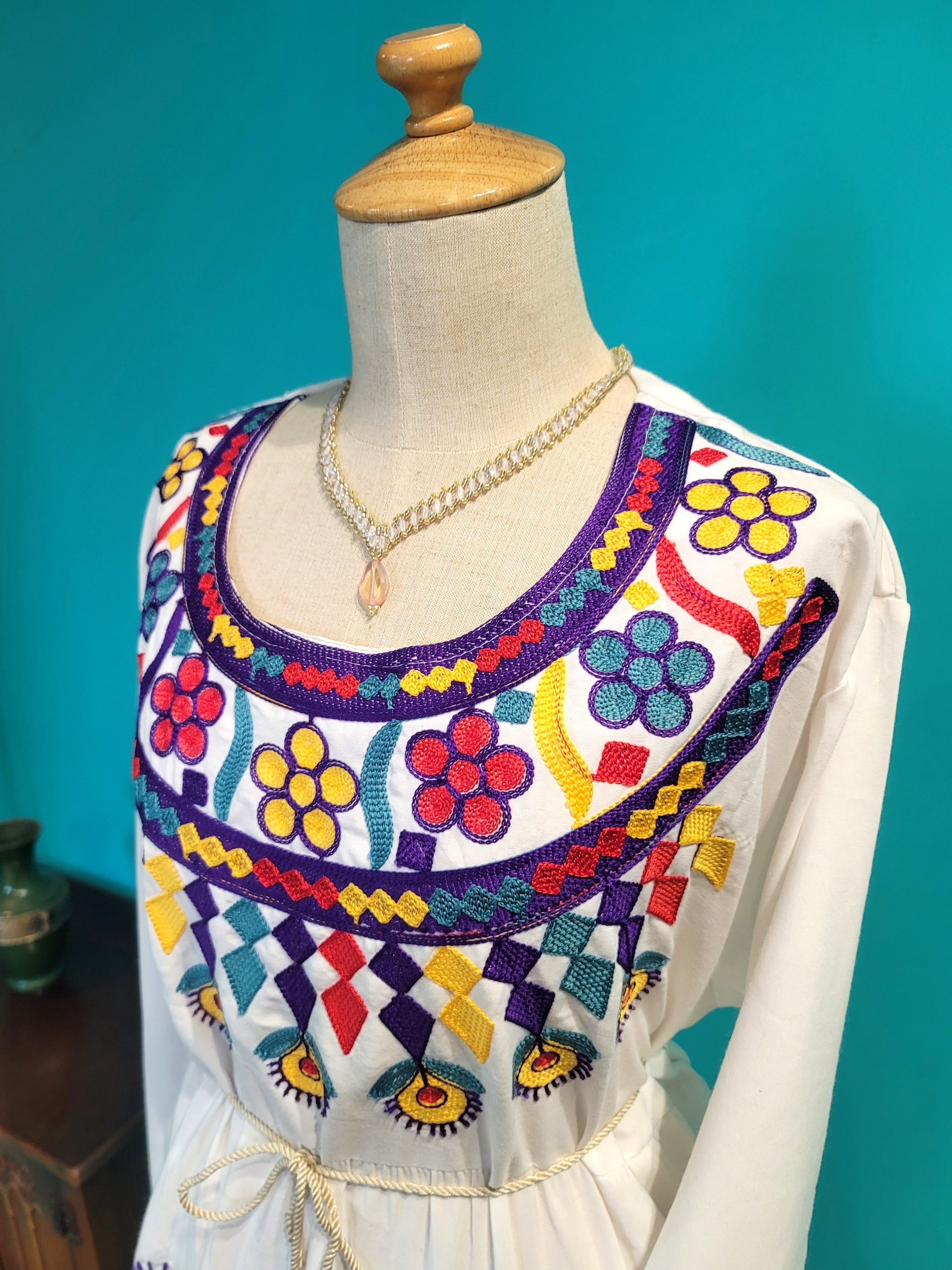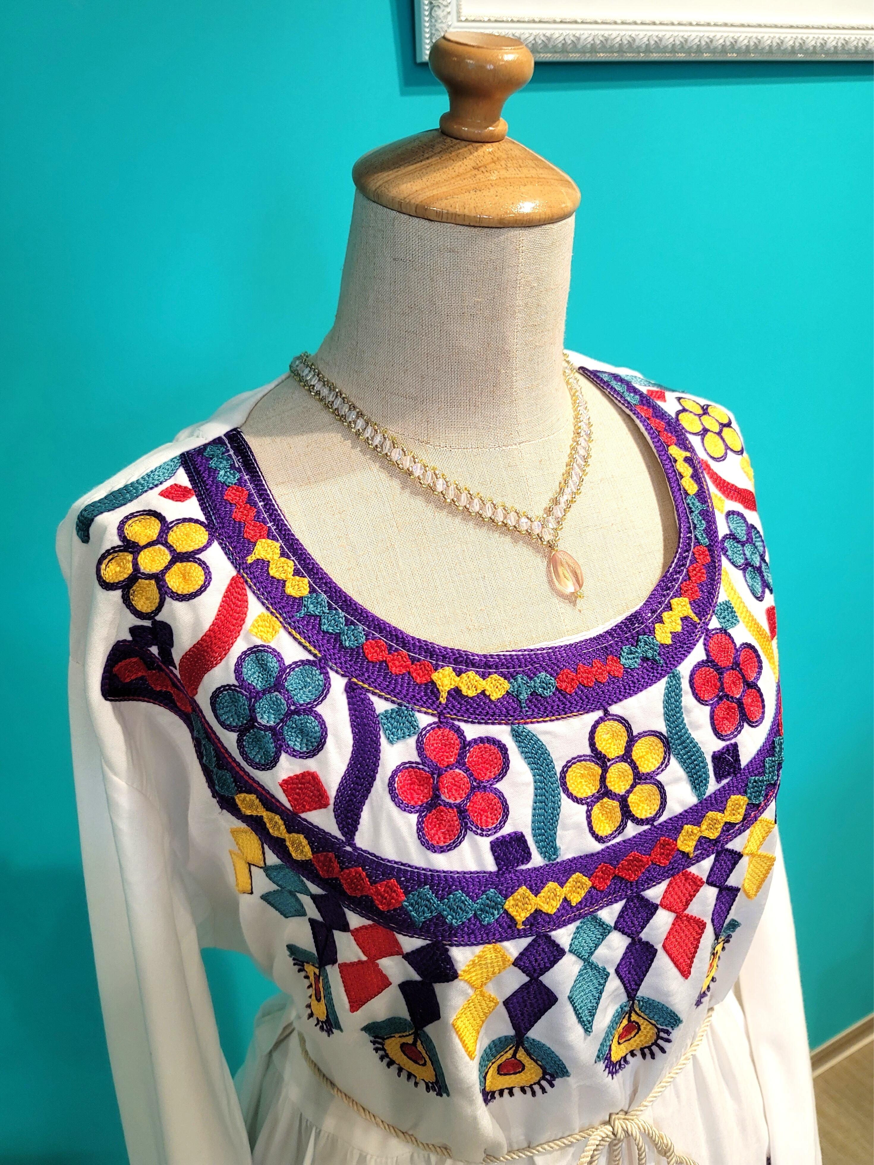 ❇️清潔感のある白をベースに、カラフルでキュートな刺繍が特徴的なデイリードレスです。肌触りの良いコットン生地で着心地も快適です。(※ネックレスは付いておりません)